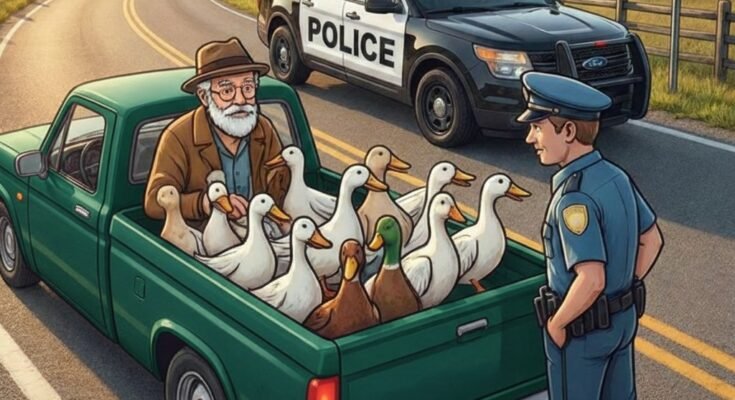 The officer blinked. Then blinked again. And finally, doing his job, he pulled the truck over.Behind the wheel sat an elderly man with sun-worn hands and a peaceful smile, the kind of face you’d expect to see at a farmers’ market rather than in traffic. The officer explained—firm but polite—that loose animals weren’t allowed in city traffic. It was unsafe. He told the man he’d need to take the ducks to the zoo.
