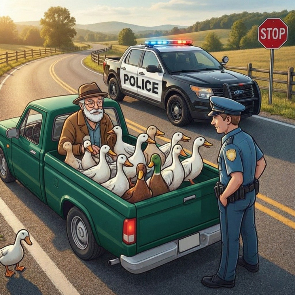 The officer blinked. Then blinked again. And finally, doing his job, he pulled the truck over.Behind the wheel sat an elderly man with sun-worn hands and a peaceful smile, the kind of face you’d expect to see at a farmers’ market rather than in traffic. The officer explained—firm but polite—that loose animals weren’t allowed in city traffic. It was unsafe. He told the man he’d need to take the ducks to the zoo.