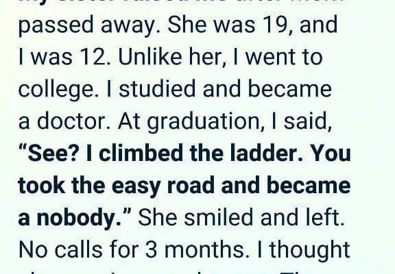 At my graduation, I searched the crowd for her face. There she was, sitting quietly near the back, clapping softly, her eyes shining with pride. When she hugged me afterward, I brimmed with confidence, feeling on top of the world. I couldn’t resist a remark laced with arrogance. “See?” I said, laughing. “I made it. I climbed every step, while you… you stayed behind.”