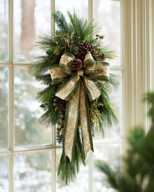 The Pine-Branch Window Swag can be styled to complement a wide range of interior design themes. For a rustic or farmhouse look, consider using jute or burlap ribbons to tie the swag. In a more contemporary setting, opt for sleek metallic hooks and minimalist embellishments. Add small fairy lights for a warm glow, or adorn the swag with contrasting bows to make it pop against neutral walls. Hang it in a prominent window to frame the view with holiday spirit, or place it above a mantel for a classic holiday focal point.