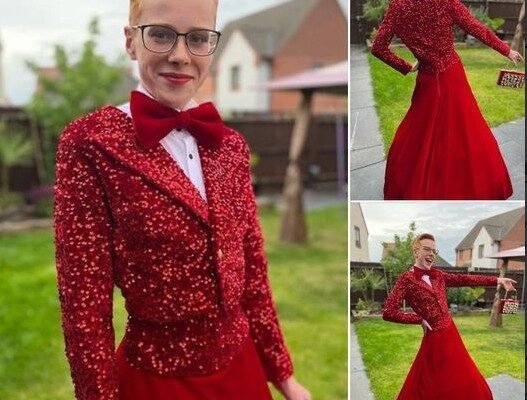 Boy, 16, delights Twitter by revealing he wore a sequined tuxedo jacket and vibrant red ballgown skirt to his prom (and even Michelle Visage is a fan!)