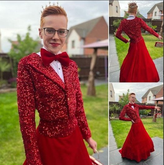 A schoolboy has sent Twitter users into a frenzy after revealing he wore a bright red skirt and sequined tuxedo jacket to his prom.
