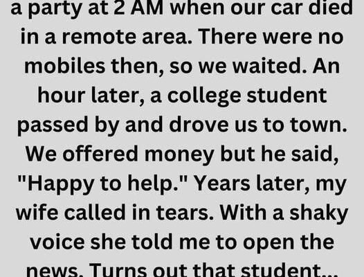 My wife and I were returning from a party at 2 AM when our car died in a remote area. There were no mobiles then, so we waited. An hour later, a college student passed by and drove us to town. We offered money but he said, “Happy to help.” Years later, my wife called in tears. With a shaky voice she told me to open the news. Turns out that student…was a wanted man.