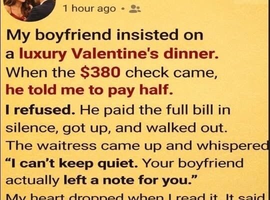 Inside, he explained that the evening was not about the restaurant or the expense. He wanted to see how we navigated disagreements and handled unexpected situations together. He wrote that relationships require communication, understanding, and the ability to respect differing perspectives. Sitting there, I realized the night had offered an unexpected lesson. It wasn’t about money—it was about balance, dialogue, and learning how to face challenges as a team.