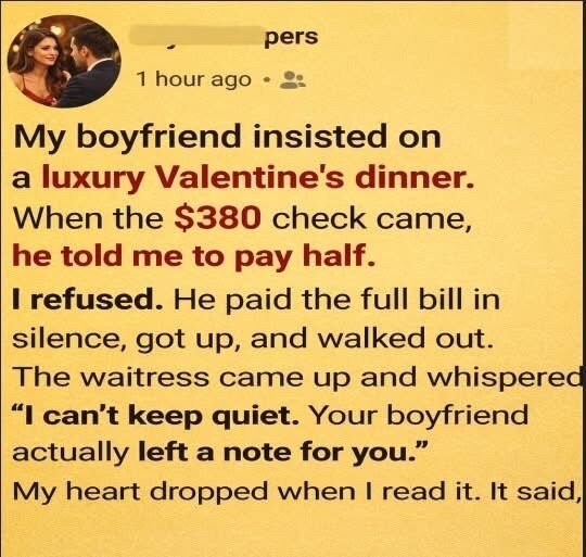 Valentine’s Day had always felt meaningful to me, even in the simplest ways. That evening, my boyfriend surprised me by insisting we dine at one of the most refined restaurants in the city. Soft music played in the background, candles reflected against polished glass, and the atmosphere felt warm and romantic. I remember appreciating how carefully he had planned everything. We shared stories, laughed over small jokes, enjoyed dessert, and for a while the night felt effortlessly perfect.