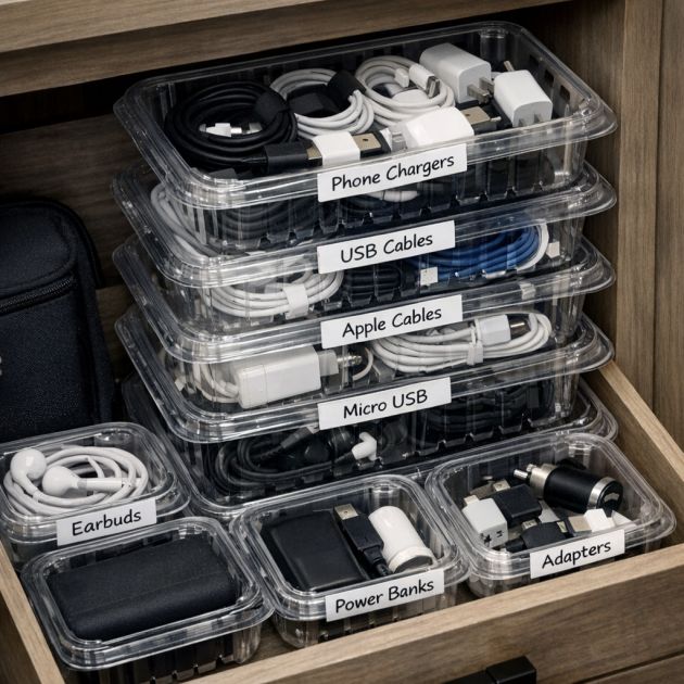 Use plastic produce containers to organize and store cords, chargers, and small tech accessories. Wrap cords neatly and place them in individual containers to prevent tangling. Label each container with the type of cord or device it corresponds to, such as ‘phone chargers’ or ‘USB cables.’ This method keeps everything tidy and prevents the frustration of searching through a jumbled mess of cords. Stack the containers in a drawer or closet for easy access and efficient storage.
