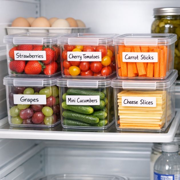 Plastic produce containers are ideal for organizing your fridge due to their uniform size and stackable nature. Use them to sort and store similar items together, such as small fruits, vegetables, or cheese. Label each container with its contents using a dry-erase marker or labels for easy identification. Their transparent nature allows for quick visibility, ensuring you can see exactly what’s inside without opening each container. By using these containers, you save space and keep your fridge tidy, making meal prep more efficient.