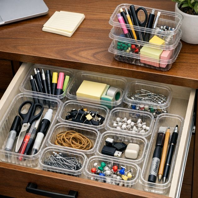 Use plastic produce containers to organize drawers and desks by creating dividers and caddies. Cut the containers to fit the dimensions of your drawers, and use them to separate items like office supplies, makeup, or kitchen utensils. For desks, stack them to hold pens, paper clips, and other small items. This not only keeps everything tidy but also makes it easy to find what you need quickly. The clear plastic lets you see the contents at a glance, which is especially useful in deep drawers.