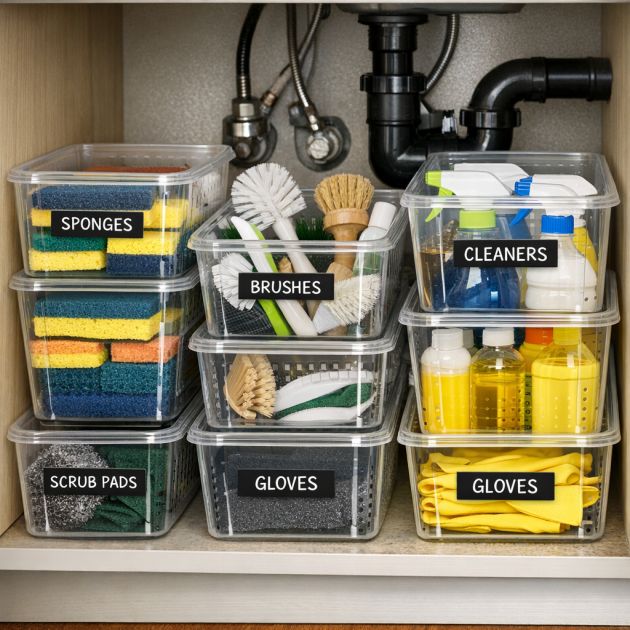 Under-sink areas can quickly become cluttered with cleaning supplies, but plastic produce containers offer an easy solution. Use them to store sponges, brushes, and bottles of cleaner, keeping each type of item in its own container. Group similar items together and label the containers for easy access. This not only maximizes space but also makes it easy to grab what you need without digging through a messy pile. Plus, their stackability allows you to make the most of vertical space.