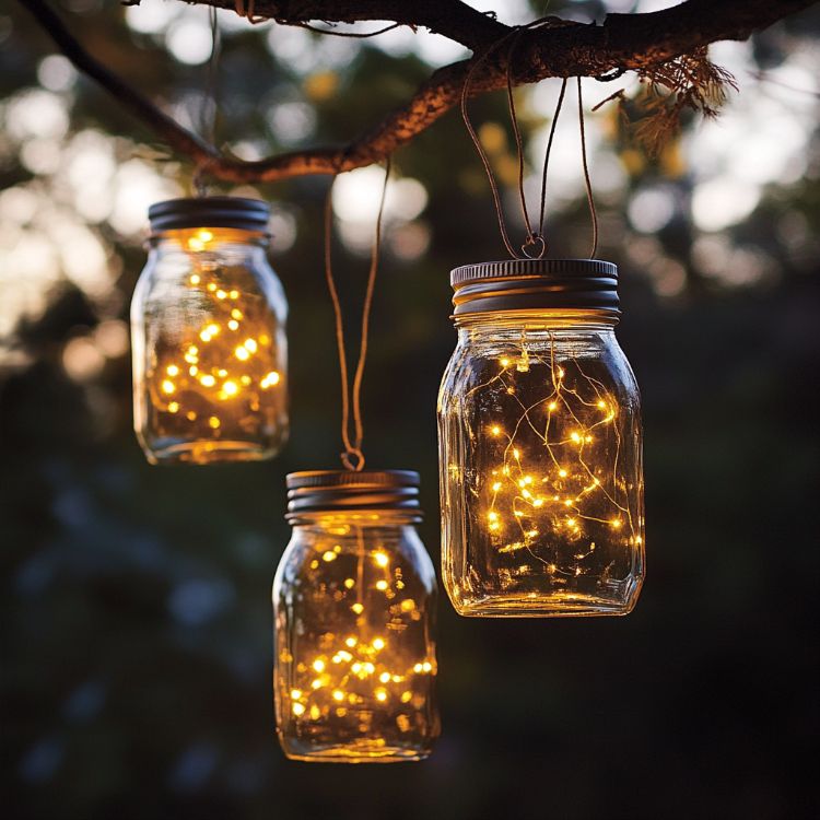 Create enchanting outdoor lanterns by turning mason jars into hanging lights. Drill small holes in the jar lids for ventilation and insert a wire handle for hanging. Place a solar-powered LED light or a battery-operated candle inside. For added decoration, wrap the jar with twine or attach small charms. Hang these lanterns from trees or hooks on your patio to create a magical ambiance for evening gatherings.