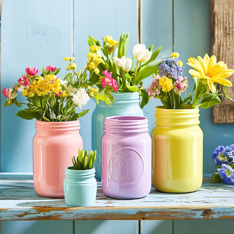 To create vibrant painted mason jars, start by cleaning the jars thoroughly to remove any labels or residue. Once dry, use sandpaper to lightly scuff the surface, helping the paint adhere better. Choose bright, spring-inspired colors like pastel pinks, yellows, and blues. Apply a base coat with a paintbrush, let it dry, and then add additional coats as needed for opacity. For a distressed look, gently sand the edges after the paint dries. Finish with a clear sealant to protect the paint. These jars can be used as vases or simply as colorful accents around your home.