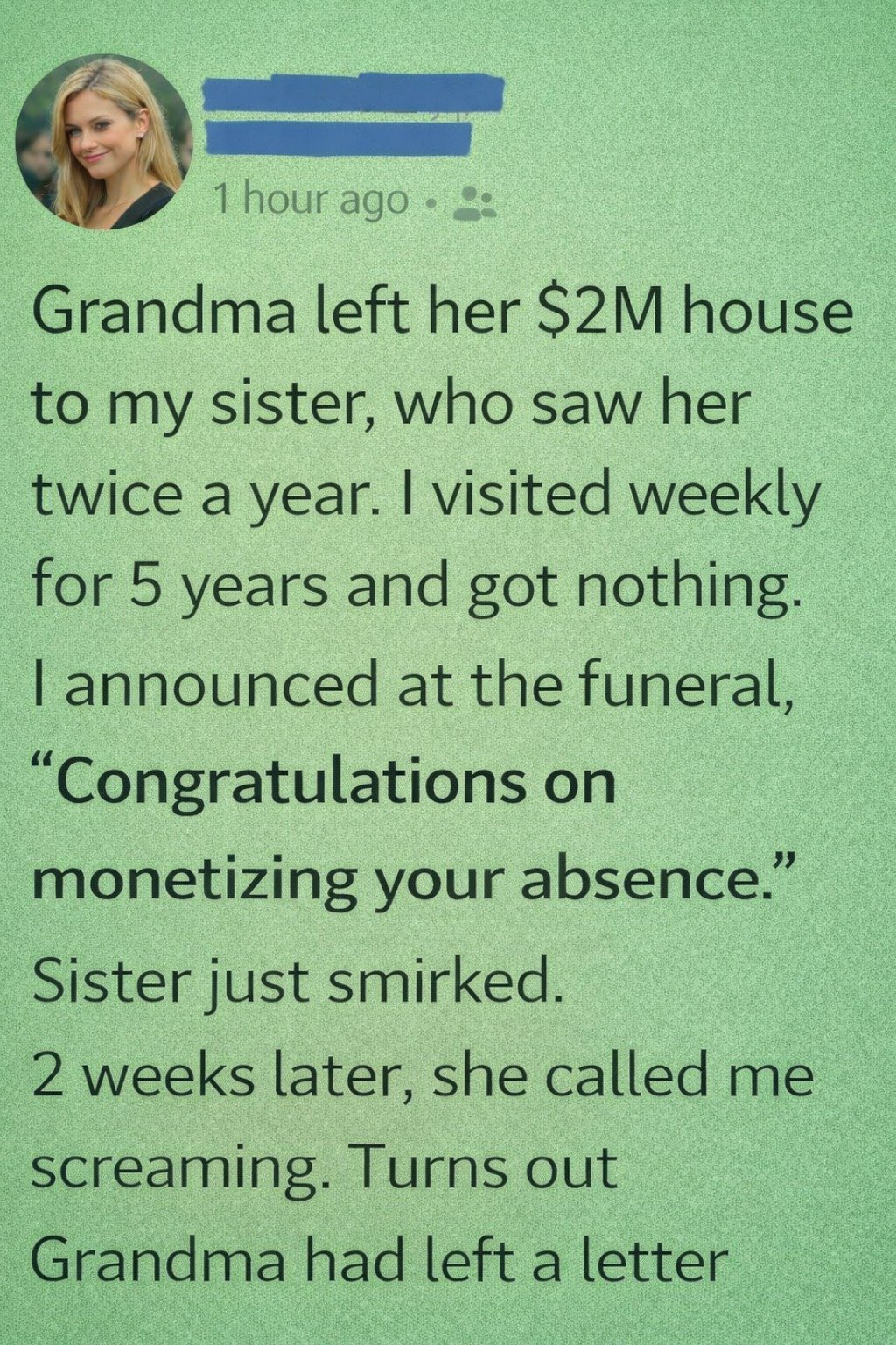 And for the first time since the funeral, I smiled—not out of spite, but understanding. Grandma hadn’t overlooked me or forgotten what I gave. She had seen me clearly.