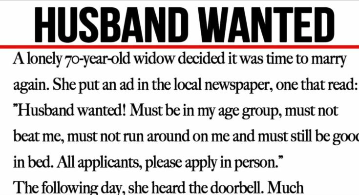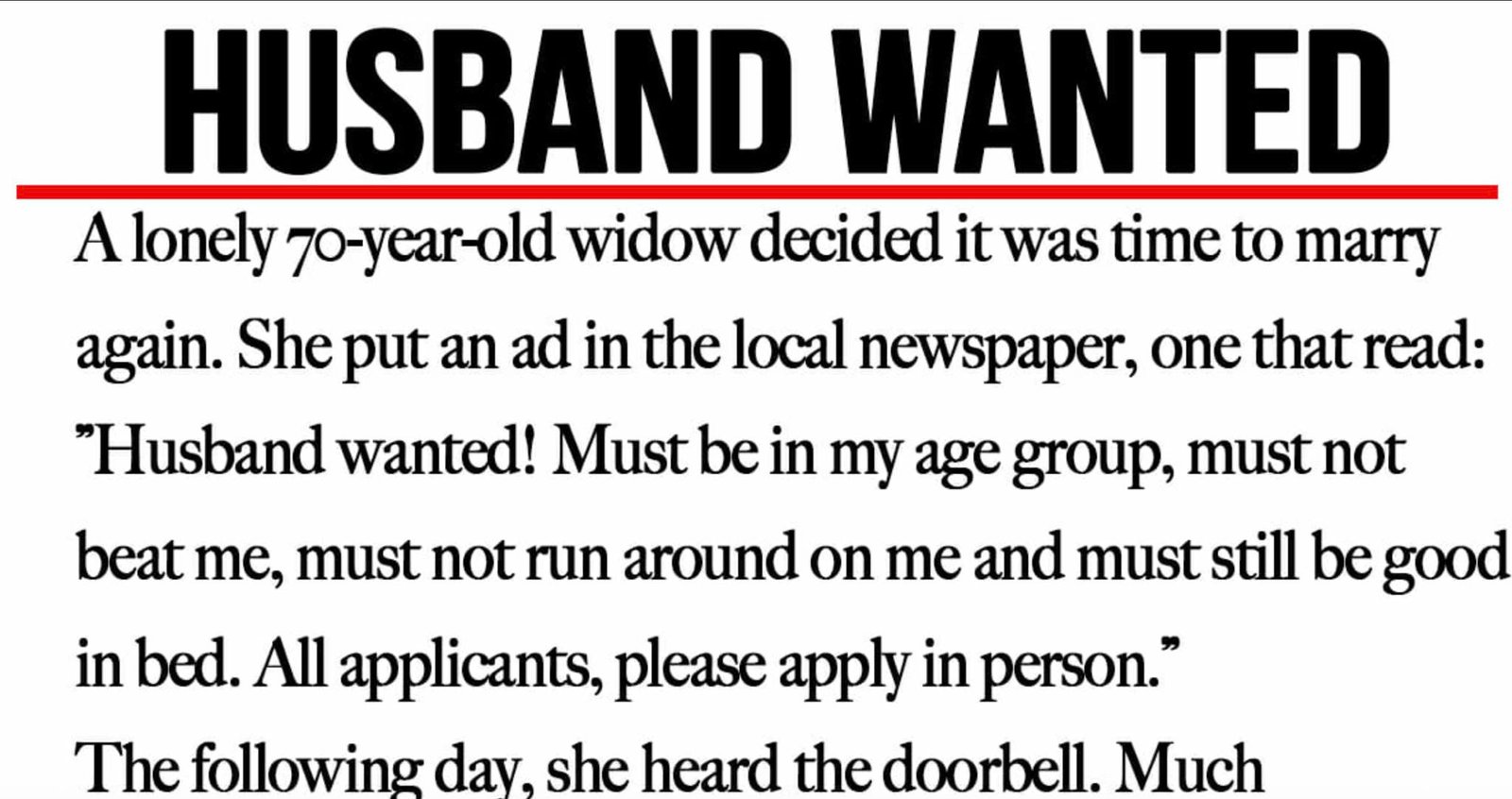 A lonely 70-year-old widow decided that it was time to marry again. She put an ad in the local newspaper that read: “Husband wanted! Must be in my age group, must not beat me, must not run around on me and must still be good in bed. All applicants please apply in person.”