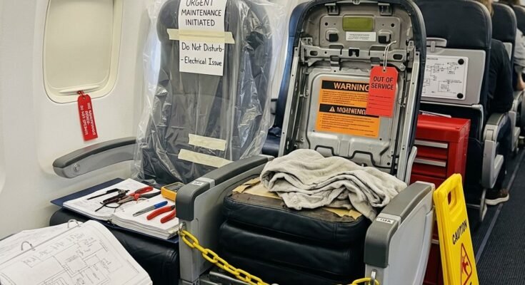 I board the plane, find my row, and immediately see my seat basically turned into a construction site. The whole thing is taped off, plastic over the headrest, tools everywhere, a giant OUT OF SERVICE tag hanging on it like it’s a broken vending machine.