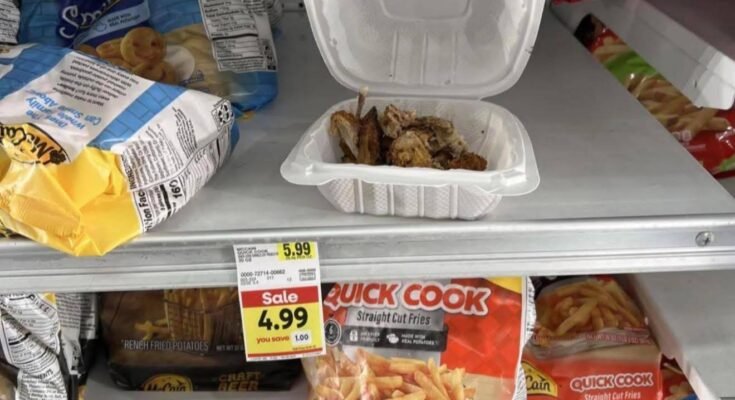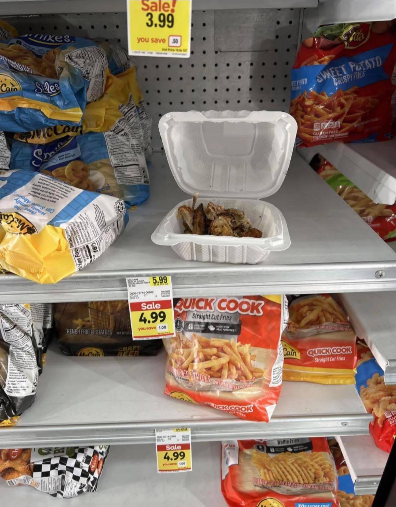 So I started looking for a trash can. None anywhere—by the freezer, the end caps, or even the registers. I’m just walking around with this greasy container like it’s my job to manage their garbage. If a store sells ready-to-eat food, they should have a place to throw it away.