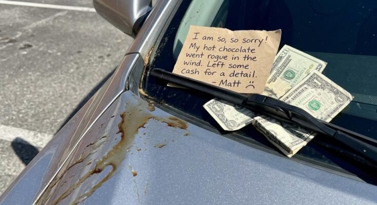 It said, “I’m so sorry, my hot chocolate went rogue in the wind, left some cash for a detail.”