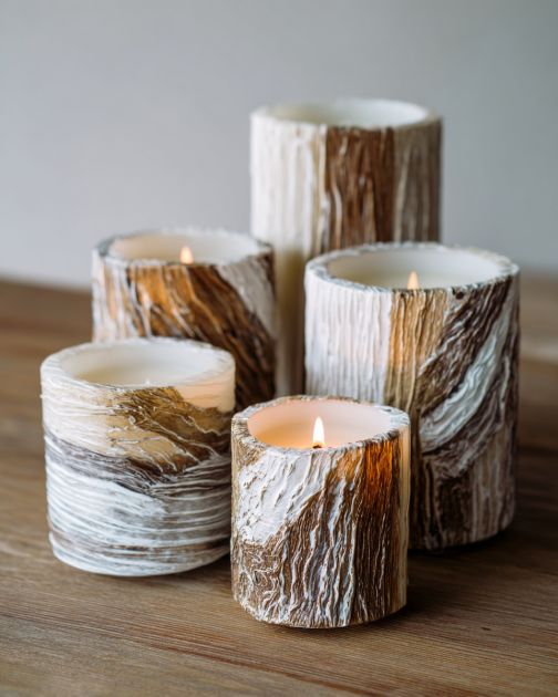 For a personalized touch, experiment with different color schemes to match your holiday decor. Consider using shades of gray for a more modern take on the wood grain effect. You can also add a touch of metallic paint for a glam twist. If you prefer scented candles, start with a plain scented candle and apply the same technique. Additionally, try using different types of plastic wrap or other textures, like bubble wrap, for unique patterns. This DIY is highly customizable, allowing you to create a set of candles that truly reflects your style.