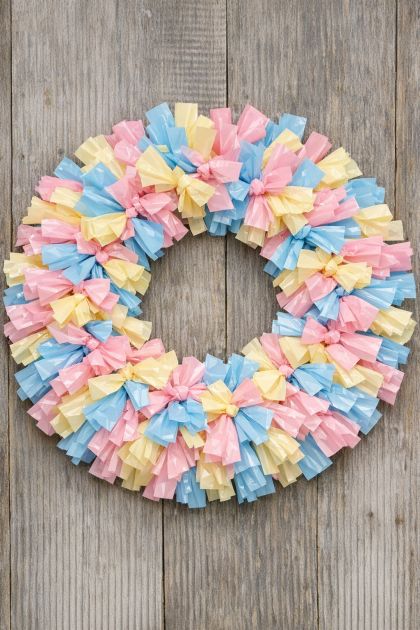 Hang this pastel rag wreath on a front door to welcome guests with a touch of springtime charm. It can also add a pop of color to an interior wall, especially when complemented by other pastel or spring-themed decor elements like vases with fresh flowers or pastel-colored throw pillows. For a cohesive look, consider pairing it with other decor in similar hues or patterns.