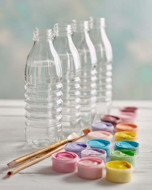 Paint the outside of the cut bottle with pastel pink or blue acrylic paint. Apply a second coat if necessary for an even finish.