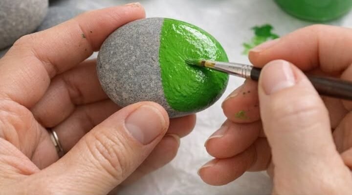 Use bright green acrylic paint to cover the surface of each stone. Apply multiple coats as needed for a rich, even color.