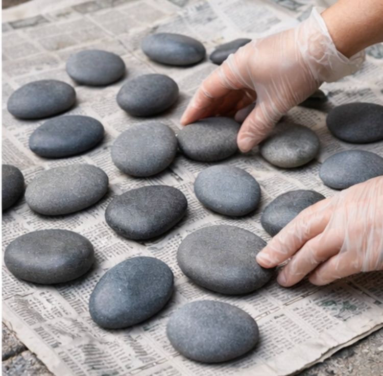 Arrange the river rocks on the drop cloth, ensuring they are spaced apart and not overlapping.