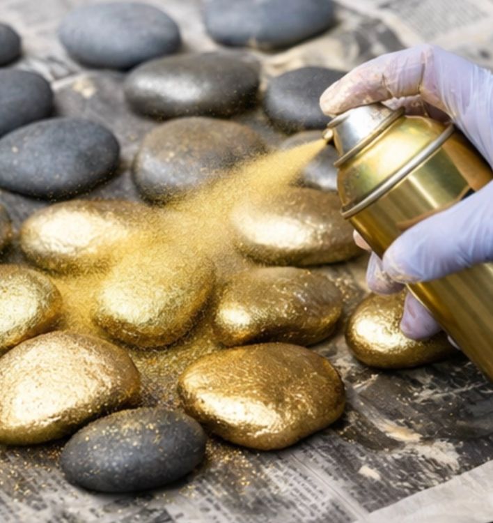 Shake the gold spray paint can well, and then begin to evenly coat each rock with the paint. Allow them to dry completely.