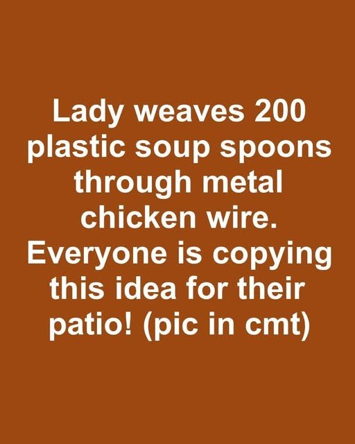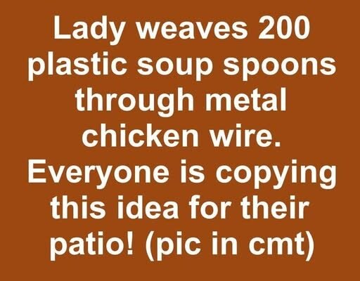 Lady weaves 200 plastic soup spoons through metal chicken wire. Everyone is copying this idea for their patio!