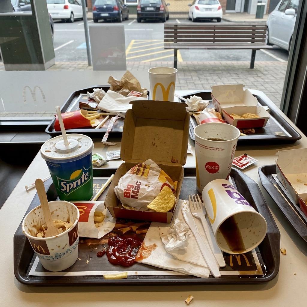 As we’re walking out, this homeless guy gets up and starts yelling at us, saying we’re being disrespectful for not throwing our trash away. He’s going off like we did something wrong, making a whole scene in the middle of the place.