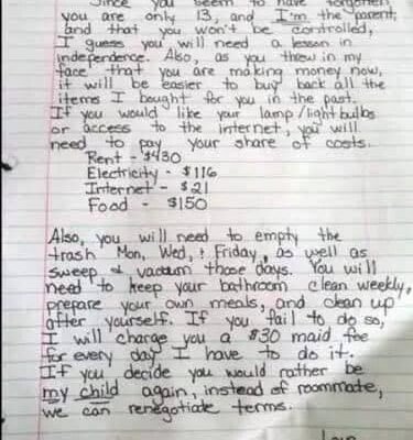 Hey Aaron, I see you forgot you’re just thirteen and I’m the parent here. Looks like you need a reminder about being independent,” Johnson’s note said, pointing out the results of Aaron’s behavior and the duties that come with acting independent.