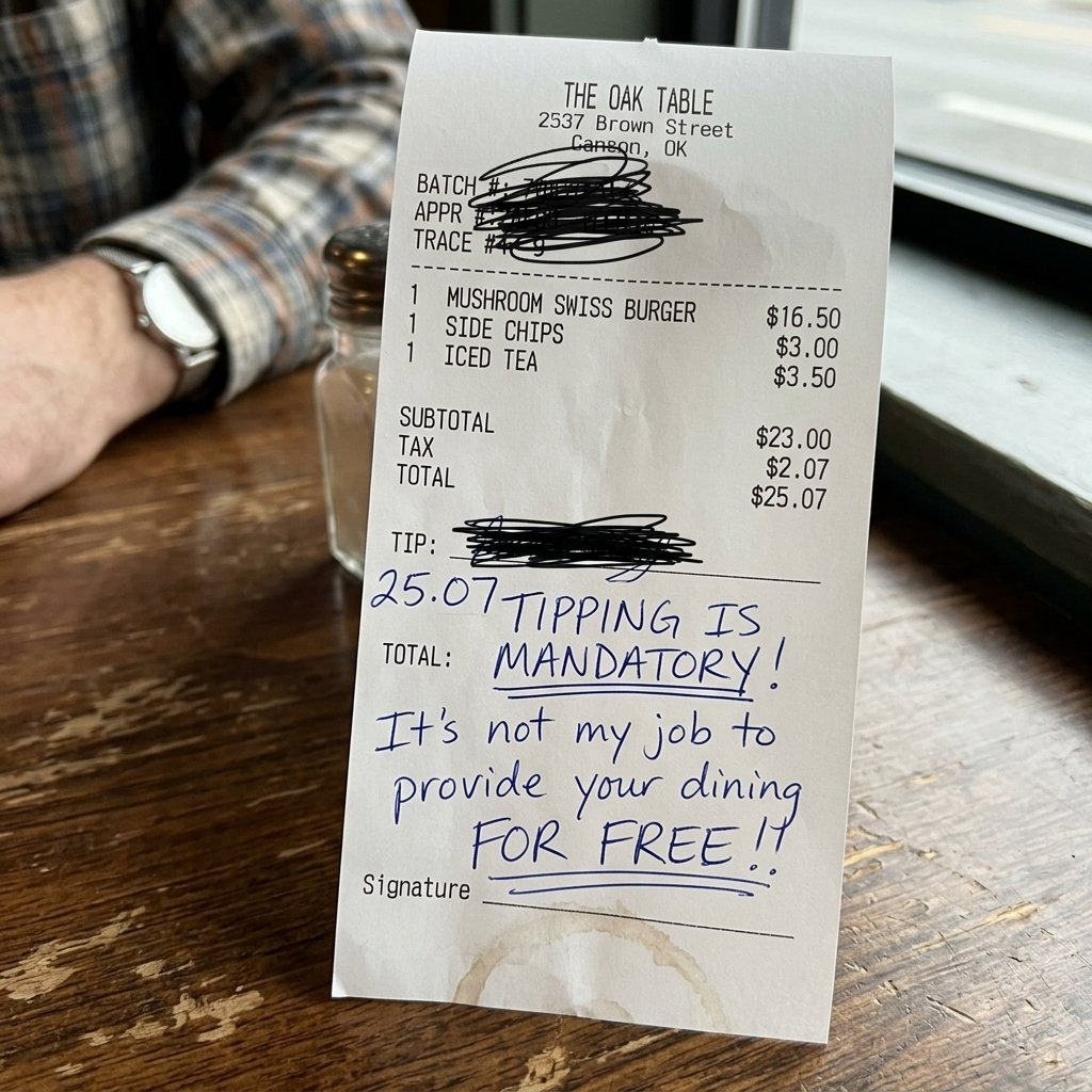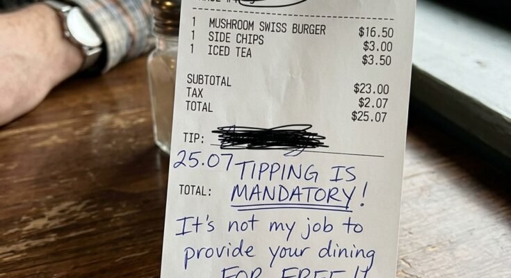 I’m thinking I did everything right, paid my tab, tipped properly, kept it moving. Then I get the receipt back and see all that writing on it, bold, underlined, talking about “tipping is mandatory” and “it’s not my job to serve you for free.” I just sat there staring at it like… what are you even talking about??