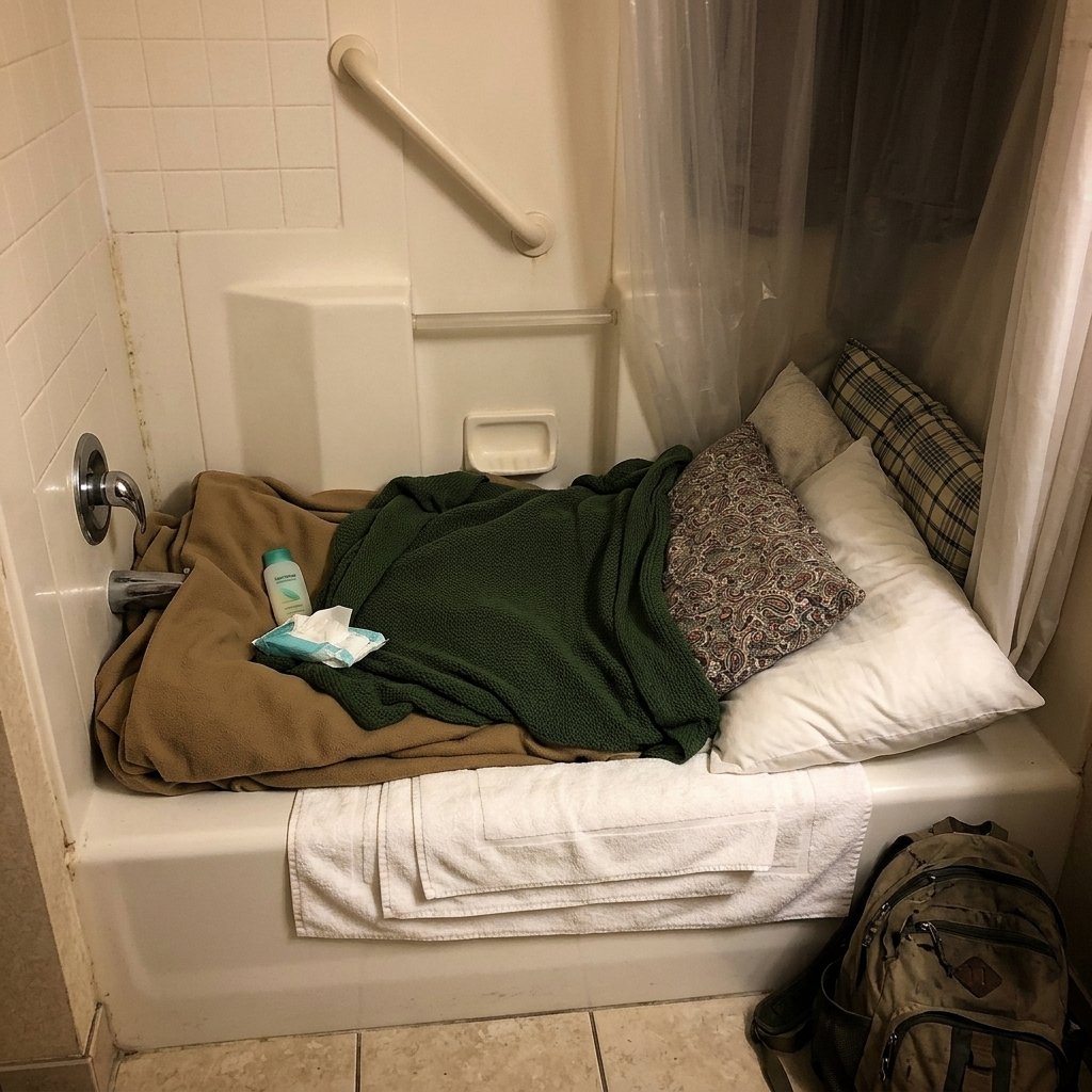 So I set up a whole situation for her in the tub. Blanket, pillows, tissue to wipe her tears, everything. Honestly it’s not even that bad, it’s clean, it works, problem solved. Because there’s no way I’m the one giving up the bed when I’m the one paying the rent. That doesn’t even make sense.
