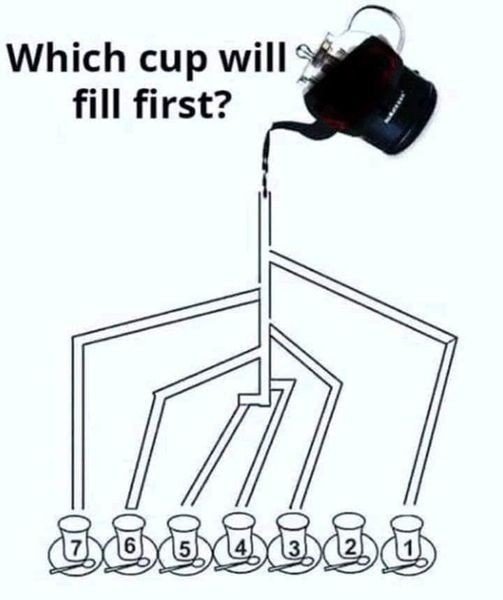 Take your time to analyze the layout. If you examine the pathways closely, you’ll notice that several cups are blocked. The paths to cups 7, 5, 4, and 3 are closed off, meaning these cups won’t fill up at all. The only open paths lead to cups 1 and 6. As the liquid enters the system, it travels down the tube, bypasses the blocked routes, and heads straight toward cup 6. Cup 6 is the one that fills up first. Did you manage to figure it out? If not, no worries—this one stumped a lot of people!