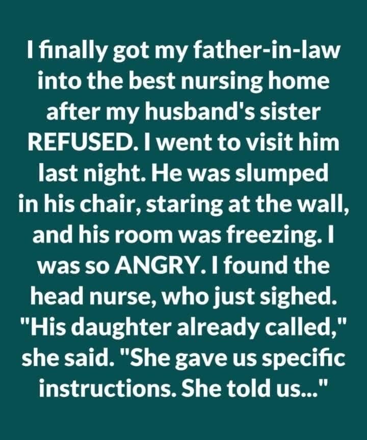 I wrapped him in blankets, brewed tea, and stayed overnight, massaging his hands and using a space heater. The next morning, I spoke with the director. “This borders on elder neglect,” I said. Legally, Diane had authority, but something in me shifted. At home, I found old letters my father-in-law had written to my husband, expressing trust in me to make decisions for him. I called a lawyer friend, Colin, and began documenting every visit—his condition, room temperature, meals, and interactions.