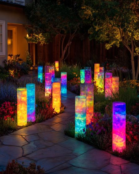 These illuminated pool noodle sections can be styled to complement a variety of backyard themes. For a modern look, choose monochromatic LED lights and arrange the noodles in a geometric pattern. For a more eclectic or bohemian vibe, mix and match different colors and sizes, and scatter them around seating areas or along pathways. Consider pairing them with string lights or lanterns to enhance the ambiance.