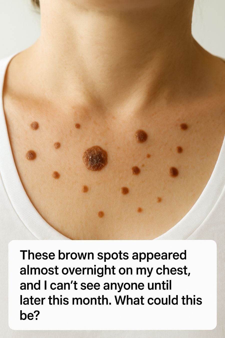 These brown spots appeared almost overnight on my chest, and I can’t see anyone until later this month. What could this be?