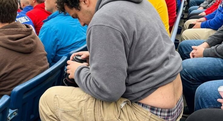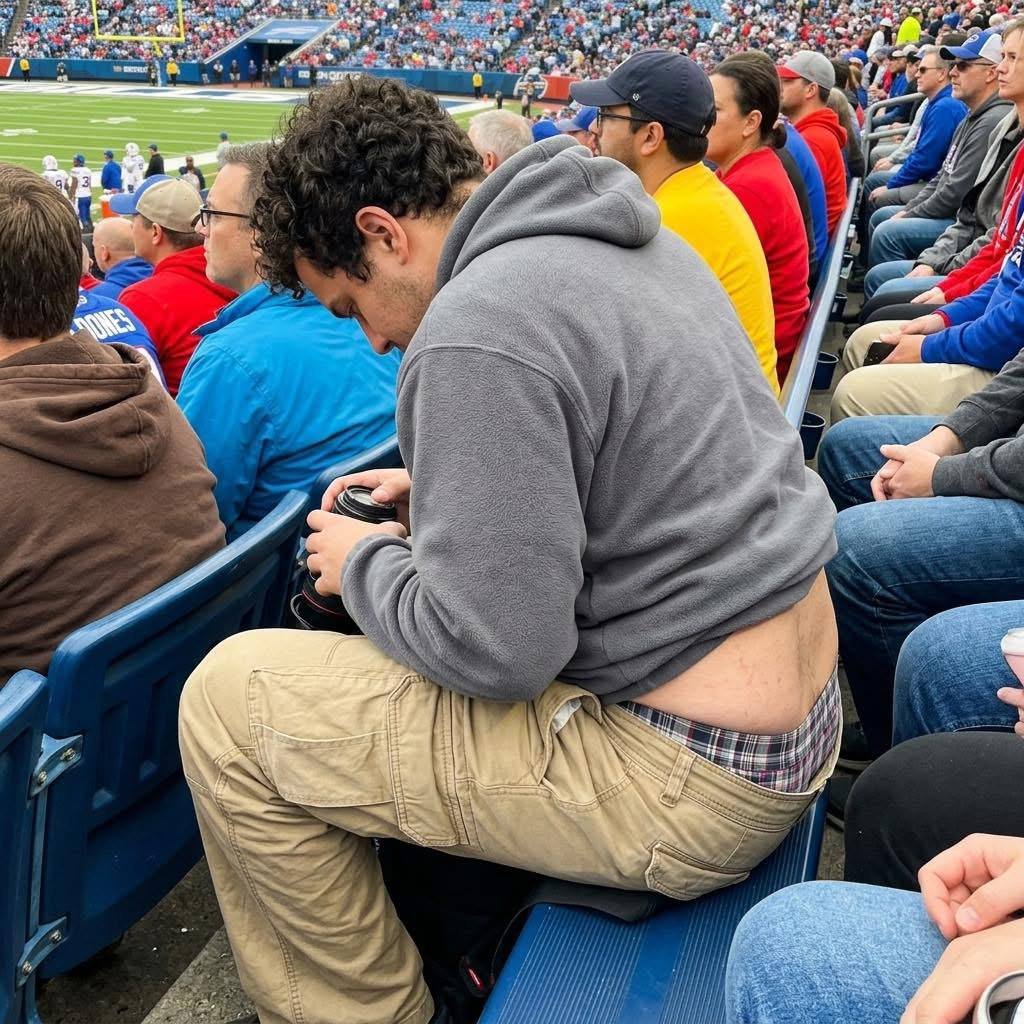 I don’t know how you have zero awareness of yourself in public, but having your entire backside hanging out like that while everyone’s just trying to watch the game is insane. You’re sitting there eating, leaning forward, completely exposed like it’s normal.