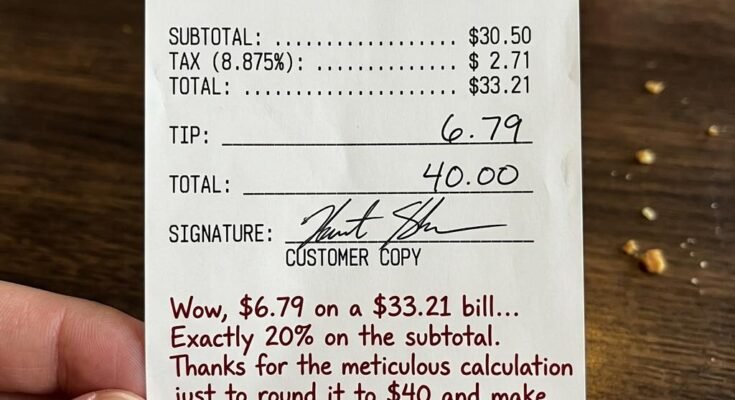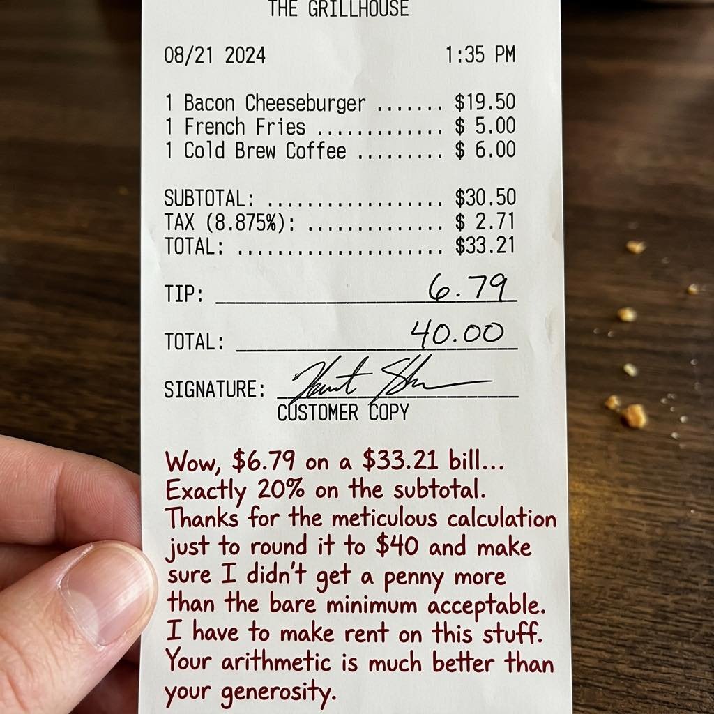 Wow, $6.79 on a $33.21 bill… March 25, 2026 - by Admin - Leave a Comment real generous. Love the effort to hit exactly 20% and still round it to a clean $40 so it feels bigger than it actually is. Nothing like doing precise math just to land on the bare minimum and call it a day.