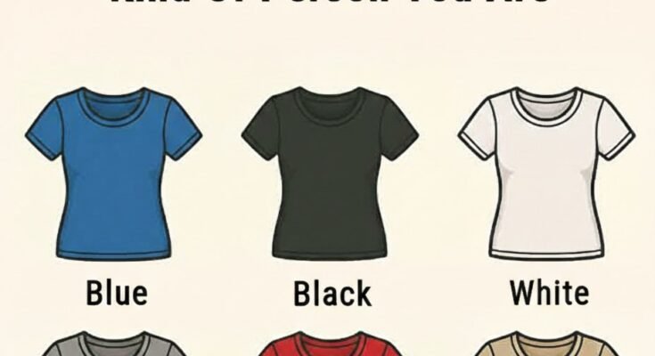 The image presents six simple options—Blue, Black, White, Gray, Red, and Beige—each shown as a plain T-shirt.